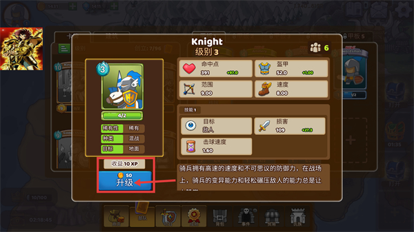 1、在部队界面消耗【50】金币升级【Knight(级别3)】,该兵种为稀有混战类,可提升命中点-盔甲等属性,强化地面作战能力。