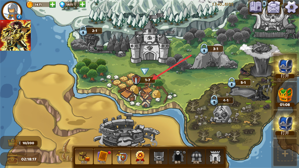 2、在地图界面选择【1-7】关卡开启挑战,同时可打开右侧宝箱获取奖励,2-1等关卡需完成前置内容解锁。