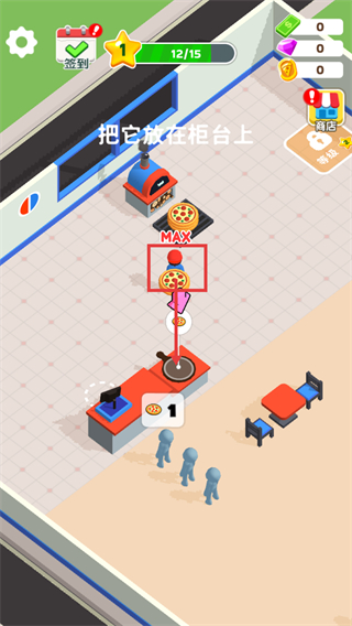 2、按【把它放在柜台上】的提示,将拿到的披萨放置到柜台处,配合【MAX】状态操作保障流程衔接。