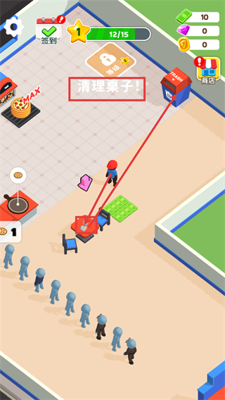 4、遵循【清理桌子!】的提示进行操作,借助【TRASH】设施完成餐桌清洁,维持店铺的运营秩序。