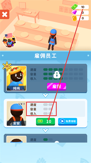 2、在【雇佣员工】界面,选择对应员工并消耗资源雇佣,提升店铺的【速度】-【容量】-【收入】相关运营效率。