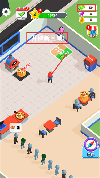 1、按照【开辟新区域!】的提示操作,解锁【新区】区域,以此扩展店铺的运营空间,推进业务规模的提升。