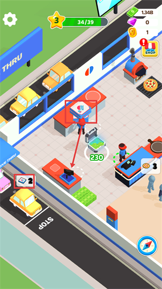 4、领取场景内的金币堆资源,增加当前【1.34B】的资金储备,为后续店铺升级做准备。