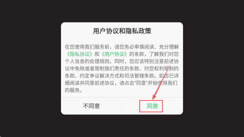 1、接受协议:阅读并同意用户协议和隐私政策,点击“同意”按钮继续。