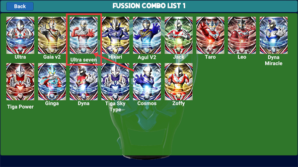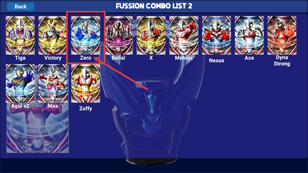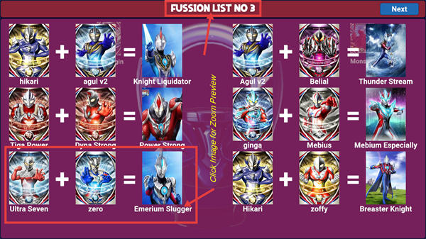1、在【FUSION-LIST-NO-3】中,选择【Ultra-Seven】与【zero】卡片组合,可融合获得【Emerium-Slugger】形态。
