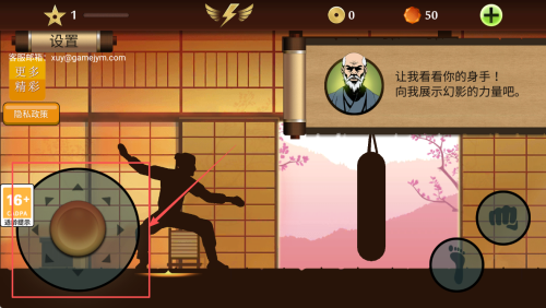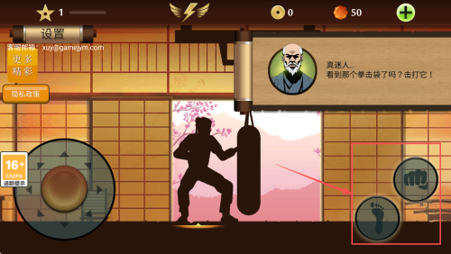 3、移动角色:使用屏幕上的虚拟摇杆控制角色移动,接近沙袋进行攻击。