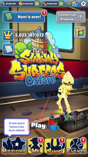 1、进入游戏:打开游戏,主界面会显示“任务”、“我”、“商店”和“活动”四个选项,点击“Play”按钮进入游戏。