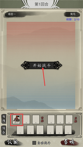 1、进入【第1回合】-难度一界面,确认【统御:2/10】及布阵的【当康Lv0】,点击【开始战斗】开启对局。