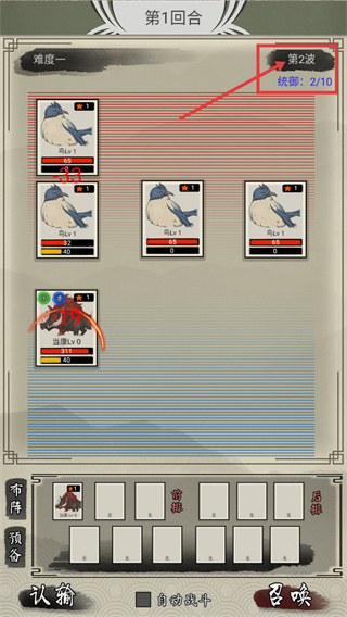 2、【第1回合】-第1波对战中,敌方为3个【鸟Lv1】,操控【当康Lv0】攻击,留意敌方血量变化推进战斗。