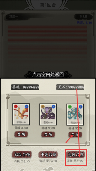 1、在召唤界面,可消耗【高级召唤-消耗灵石x50】召唤【青龙Lv0】,当前【兽魂-9999994999】【灵石-999999899】资源充足可操作。