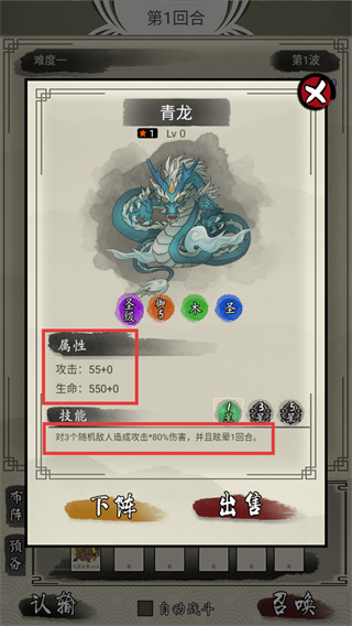 2、查看【青龙-Lv0】详情,其【攻击:55+0】【生命:550+0】,技能可对3个随机敌人造成攻击+80%伤害并眩晕1回合,助力对战控场。