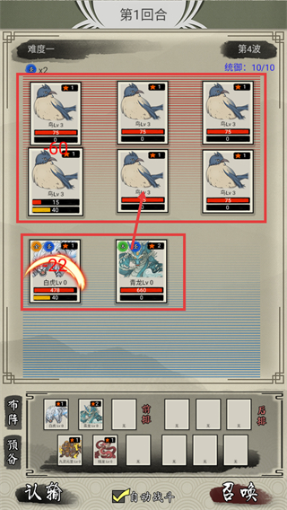 3、【第1回合-第4波】对战,统御【10/10】,派出【白虎Lv0】【青龙Lv0】对抗【鸟Lv3】,留意敌方血量变化推进战局。