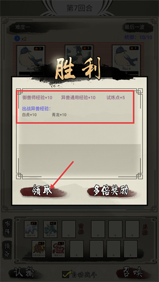 4、【第7回合-最后一波】获胜后,点击【领取】可获取【御兽师经验+10】【异兽通用经验+10】等奖励,积累资源提升战力。