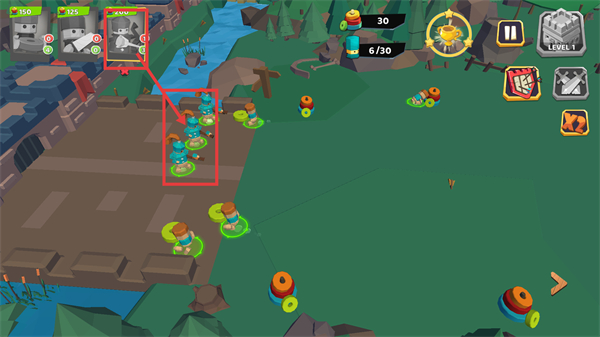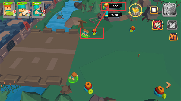 1、在【LEVEL1】界面,收集标注的【500】资源道具,当前进度【2/30】,集结下方单位以推进关卡流程。