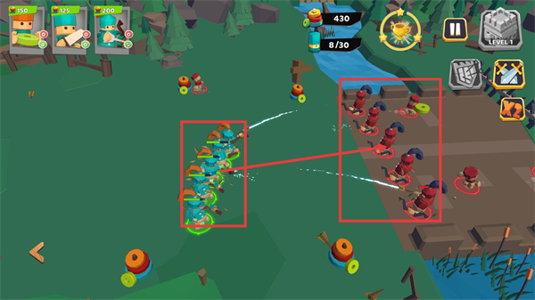 3、当前进度【8/30】,操控集结的蓝色队伍攻击红色敌方单位,同时留意【430】资源的收集以补充战力。
