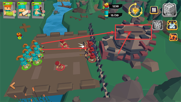 4、当前进度【15/30】,指挥蓝色队伍突破敌方防线,进攻标注的敌方建筑,同时获取【1230】资源提升实力。