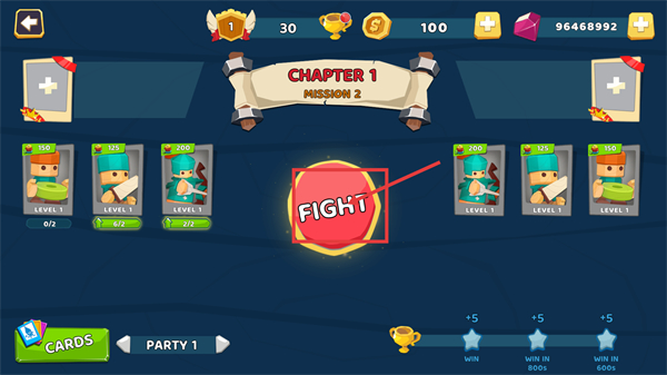 1、在【CHAPTER1-MISSION2】界面,确认已配置的【LEVEL1】单位,点击【FIGHT】按钮开启本关卡对战,推进任务进度。