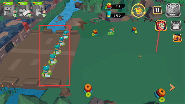 2、进入【LEVEL2】界面,当前进度【7/30】,集结标注的己方单位队伍,同时收集【115】资源强化战力。