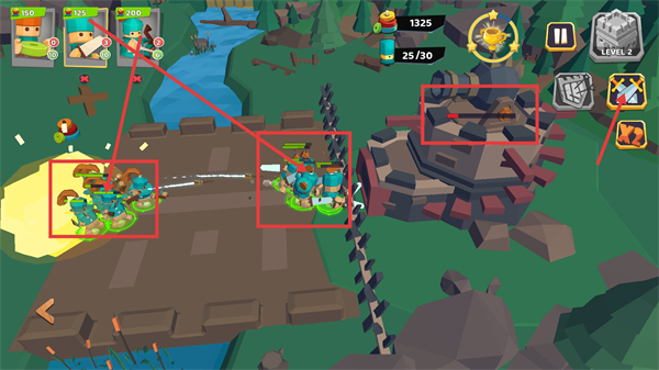 3、当前进度【25/30】,指挥己方队伍进攻标注的敌方建筑,同时获取【1325】资源,推进关卡进程。
