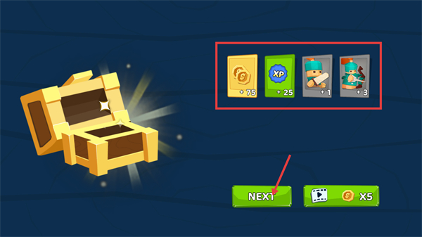 4、通关后打开宝箱,获取【金币+75】【XP+25】等奖励,点击【NEXT】按钮进入下一个关卡。