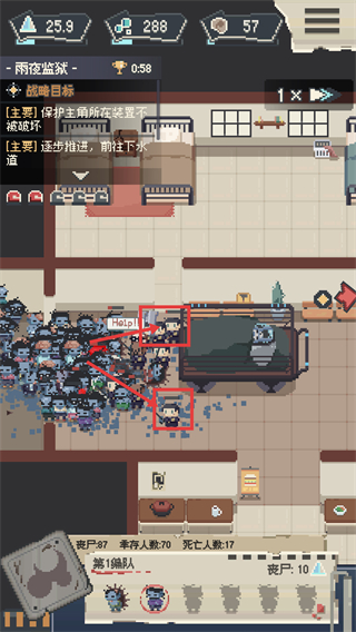3、【雨夜监狱】关卡进程中,需保护主角装置,同时救援标注的幸存者,留意【丧尸:87】【幸存人数:70】的数值变化以调整策略。