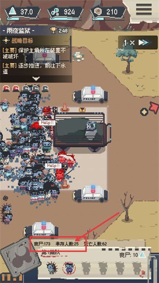 4、【雨夜监狱】后期阶段,面对【丧尸:173】【幸存人数:25】的局势,继续保护主角装置,稳步推进前往下水道的战略目标。