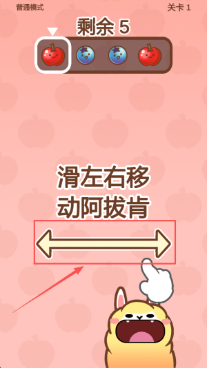 2、掌握操作:在“普通模式 关卡1 剩余5 滑左右移动阿拔肯”界面左右滑动控制角色。
