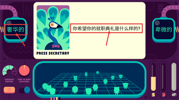 2、面对【你希望你的就职典礼是什么样的?】的提问,在【奢华的】与【卑微的】选项中抉择,影响初期公众印象。