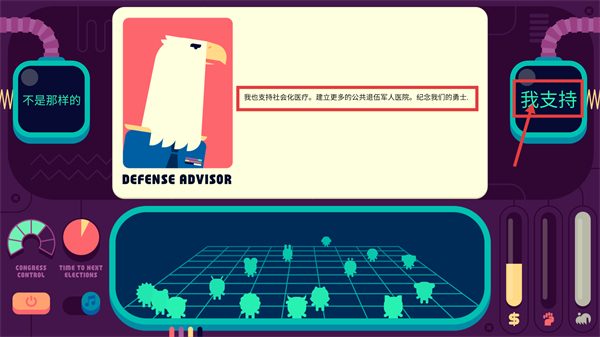 3、国防顾问提议【社会化医疗-建立更多的公共退伍军人医院】,选择【我支持】可推进该政策,积累相关群体支持。