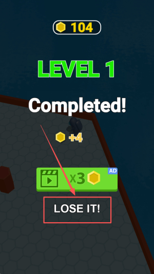 4、结算奖励:出现LEVEL 1 Completed! +4 X3,点击AD翻倍或LOSE IT!直接领取。