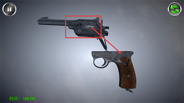 4、当【时间-134.172】时,参照红色标注的转轮部件,将其与枪身对应位置匹配,推进该左轮的组装进程。