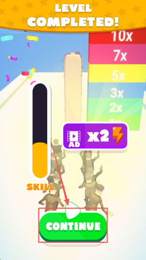 4、完成结算:显示LEVEL COMPLETED! 10x 7x 532,点击CONTINUE继续升级。