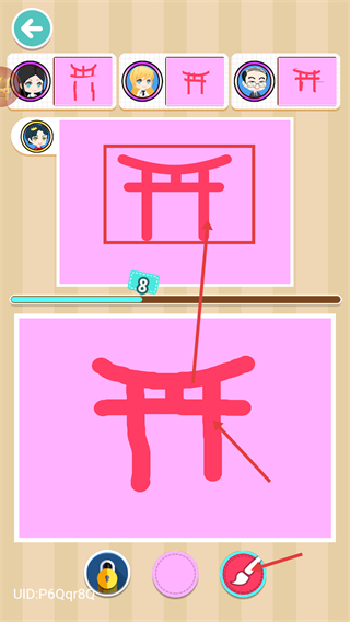 2、根据上方【红色-开字-轮廓】,使用底部【画笔工具】跟随虚线绘制,推进当前【进度条-8】的关卡进度。