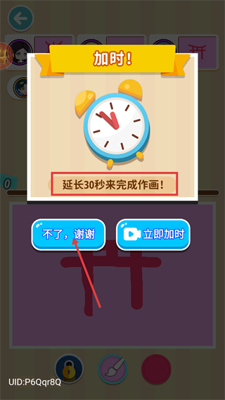 3、出现【加时】弹窗时,若作画进度不足可选【立即加时】延长30秒,进度足够则选【不了-谢谢】继续。