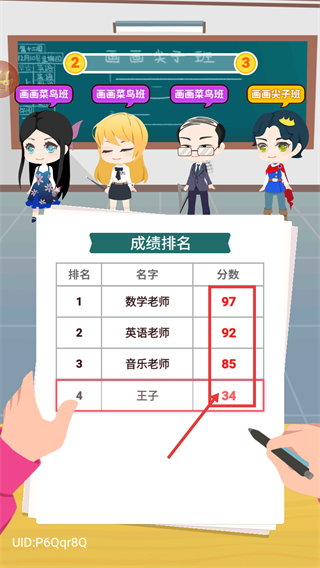 4、查看【成绩排名】,当前【王子-34-分数】排第4,后续关卡需提升绘画精准度来提高分数与排名。