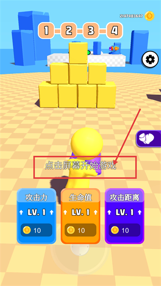 1、点击屏幕开始游戏,可消耗【10-金币】升级【攻击力-LV.1】【生命值-LV.1】等属性,强化角色后推进当前关卡。