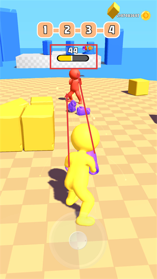 3、持续攻击将敌人血量压制至【44】,同时收集沿途【紫色道具】,提升角色战斗能力以应对后续挑战。
