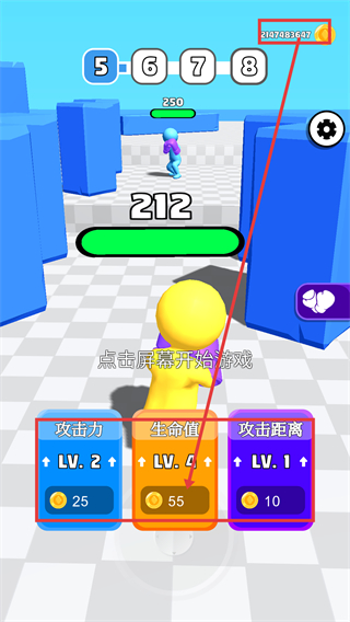 1、点击屏幕开始游戏,消耗【25-金币】升级【攻击力-LV.2】,再强化【生命值-LV.4】,提升战力以应对【250-血量-蓝色敌人】。