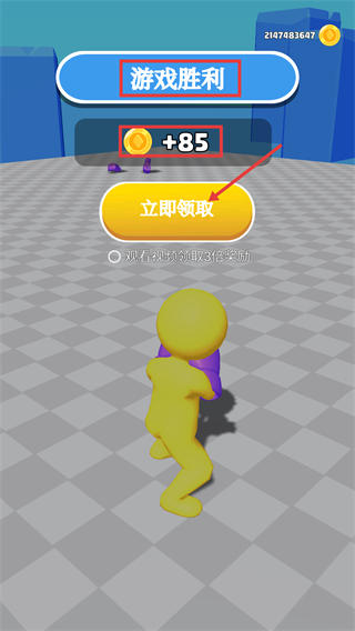 4、完成关卡触发【游戏胜利】,点击【立即领取】获取【+85-金币】,也可选择观看视频领取3倍奖励积累资源。