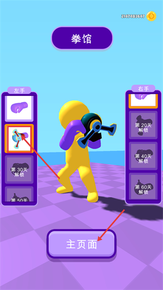 1、在【拳馆】界面,装备【左手-已解锁-武器】,后续可通关【第20关】解锁【右手】道具,点击【主页面】返回关卡界面推进流程。