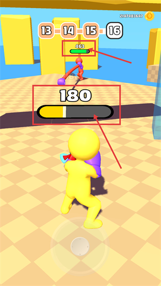 2、处于【13-14-15-16关】区域,瞄准【463-血量-红色敌人】攻击,同时关注自身【180-血量】状态,稳步消耗敌方血量。
