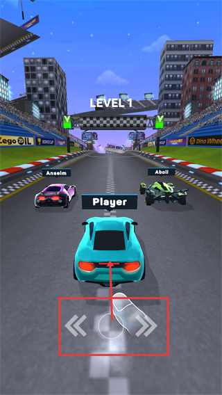 1、在【LEVEL1】赛车关卡中,通过底部【左右移动按钮】调整蓝色赛车的赛道位置,避开对手(Anselm、Aboli)的阻挡,推进比赛进程。