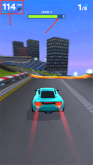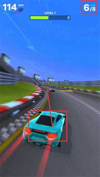 3、持续操控赛车超越剩余对手,将排名提升至【1/8】,同时推进关卡进度条向终点靠近。