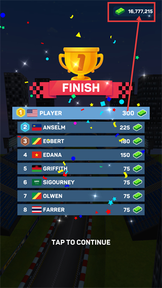 4、冲过终点后获得【第1名】,领取【300-金币】奖励,当前总金币累计至【16,777,215】,点击界面可继续后续关卡。