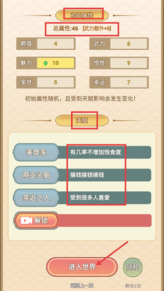 3、查看【初始属性】-【总属性46-【武力额外+1】】后,选择【天赋】如【美食家有几率不增加饱食度】,选好后点击【进入世界】。