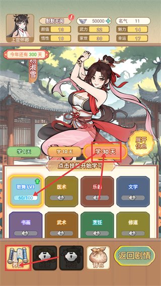 1、在养成界面选定【歌舞-LV1-60/100】技能,选择【学30天】进行学习,可提升该技能进度,助力角色养成。