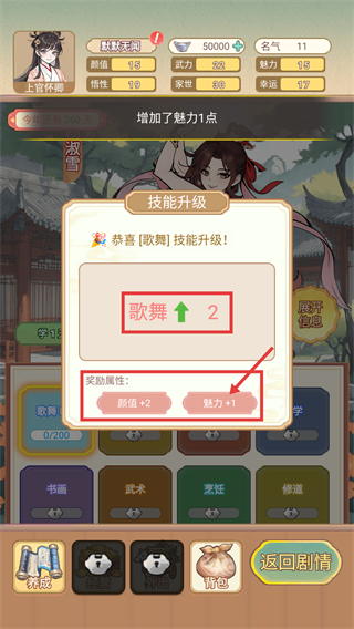 2、【歌舞】技能升级至2级,获得【颜值+2】【魅力+1】的属性奖励,界面同步提示魅力数值已增加。