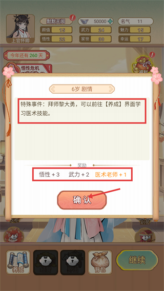 3、触发【6岁-剧情】特殊事件,拜师黎大勇,领取【悟性+3】【武力+2】等奖励后,可前往养成界面学医术。