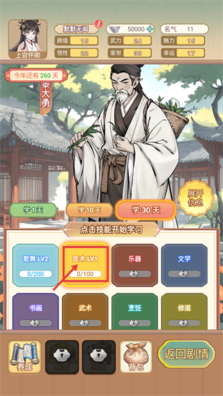 4、养成界面解锁【医术-LV1-0/100】技能,选定该技能后选择学习天数,可推进医术技能的养成进度。