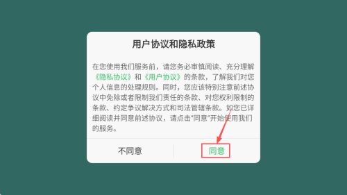 1、同意协议:点击“同意”按钮,接受用户协议和隐私政策。